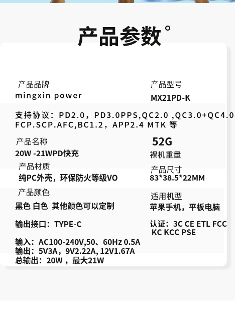 -MX20WPD快充過(guò)3C CE ETL FCC PSE KC KCC認(rèn)證 高光面超薄僅22mm